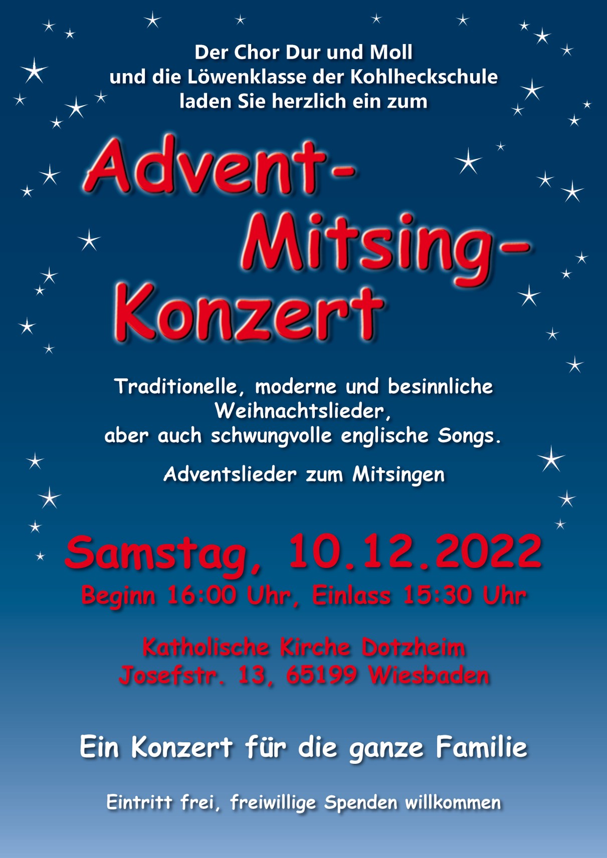 Liebe Freunde, Familie, Eltern und Schüler, wir, Dur und Moll unter Leitung von Helga Liewald, sowie die Löwenklasse der Kohlheckschule unter Leitung von Heike Lill, laden Sie und Euch am 10.12.2022 in die katholische Kirche Dotzheim, zu einem Advent-Mitsing-Konzert herzlich ein.