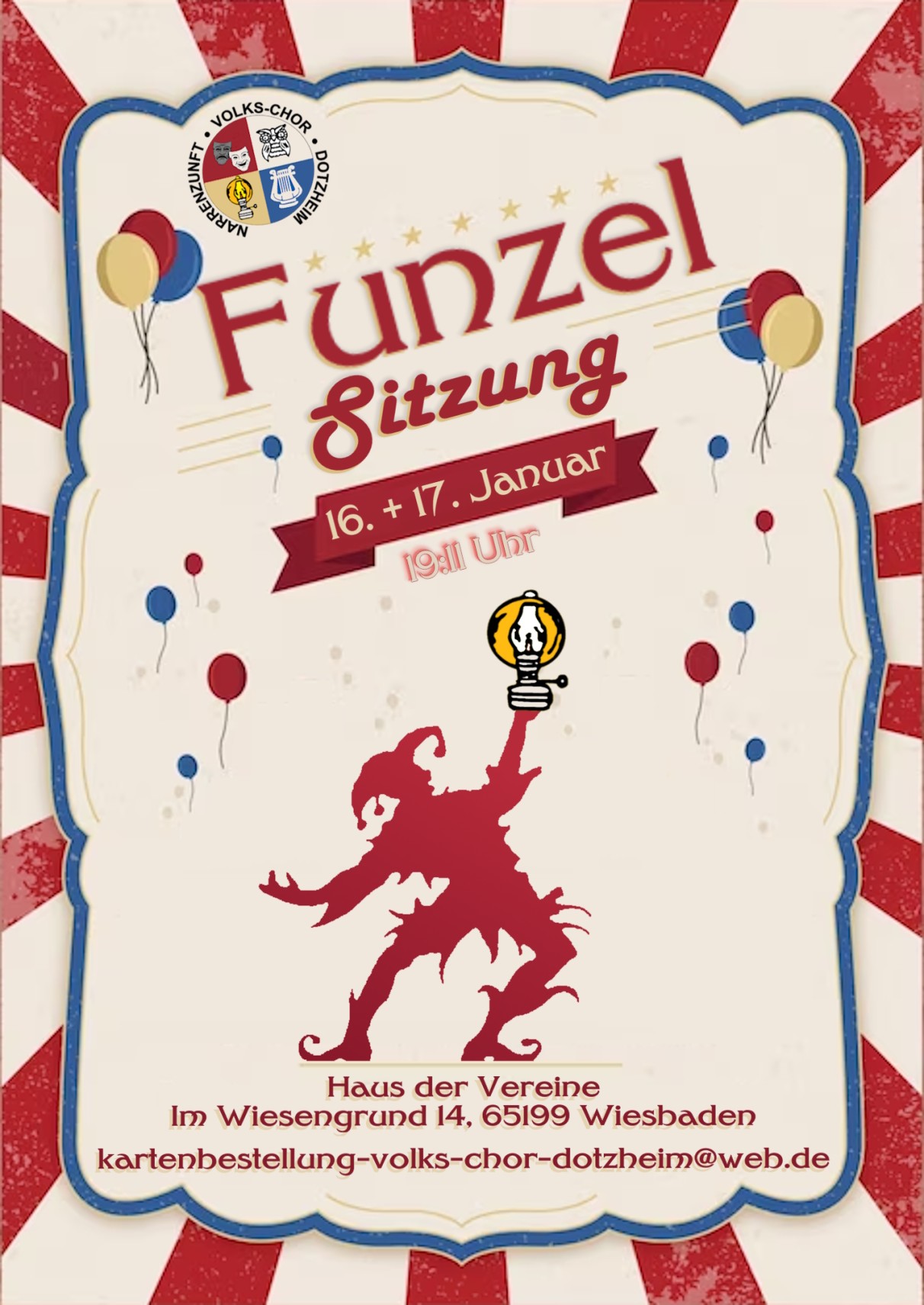 Die Narrenzunft vom Volks-Chor Dotzheim feiert ihre närrischen Funzelsitzungen, am 16.01. & 17.01.2026. Karten können ab sofort bestellt werden.