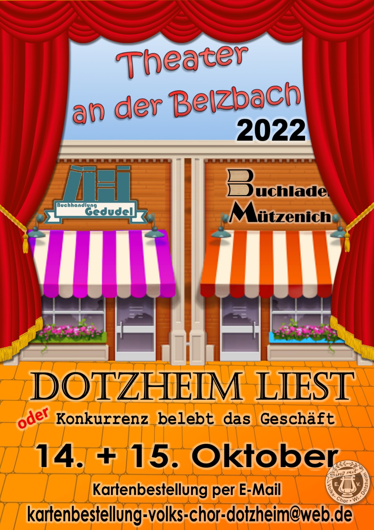 Liebe Theaterfreunde unser Vorhang wird sich wieder öffnen. Wer hätte das gedacht!!! Ein humorvoller Dreiakter aus der Feder von Jürgen Stumm spielt am 14.10.& 15.10.22 im Haus der Vereine, „Dotzheim liest oder Konkurrenz belebt das Geschäft.“ Freuen Sie sich mit uns. Karten können ab sofort unter kartenbestellung-volks-chor-dotzheim@web.de oder auf unserer Website unter dem Button Kartenbestellung bestellt werden.