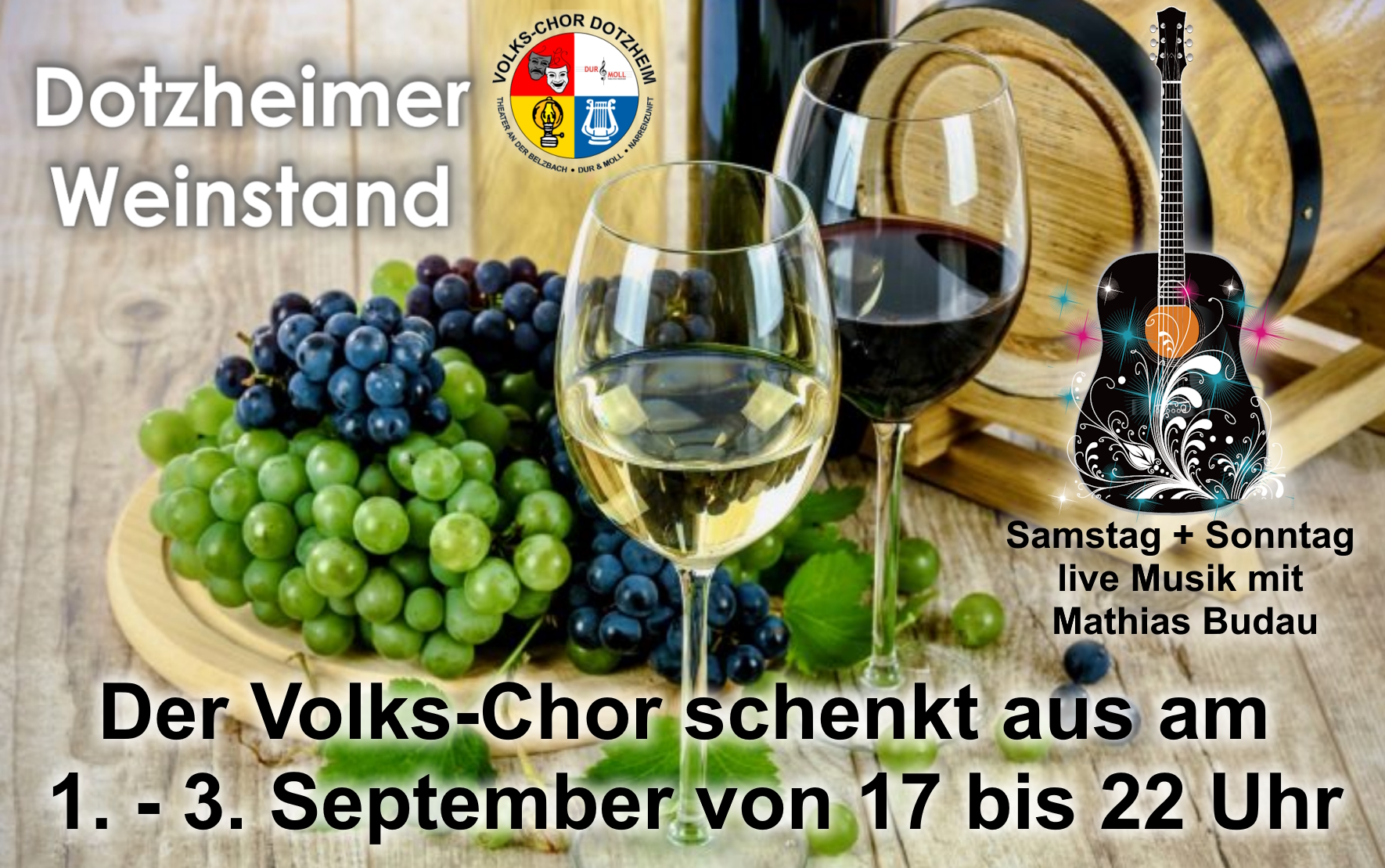 Vom 01.09.- 03.09.2023 bewirtet der Chor an allen 3 Tagen den Dotzheimer Weinstand! Freitag bis Sonntag von 17:00-22:00 Uhr. Samstag & Sonntag mit schöner musikalischer Untermalung, Gesang mit Mathias Budau.